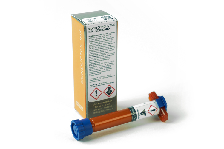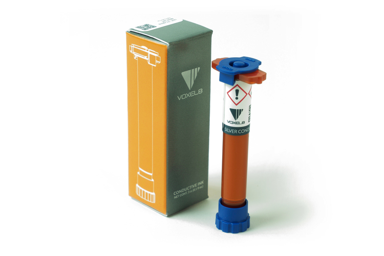 A highly conductive silver ink formulated for printing 3D electronics. Each cartridge contains 3cc of silver ink that can print approximately 60 meters of conductive trace.