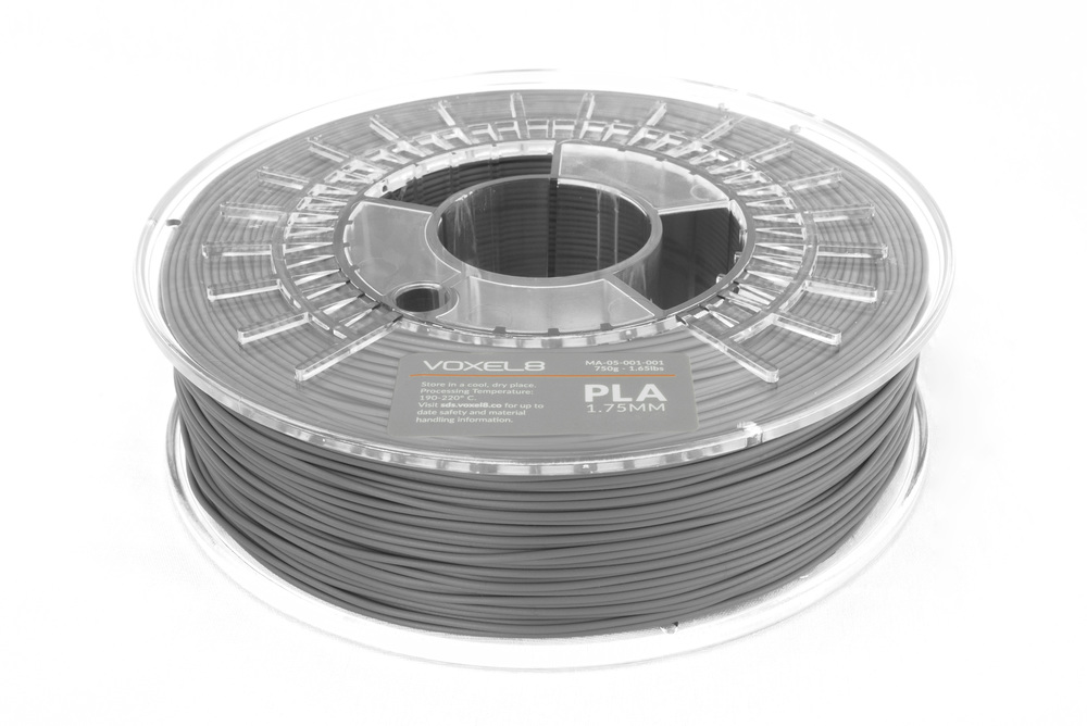 Voxel8’s PLA has a filament diameter of 1.75 mm, is colored Dark Grey, and comes with a clear reel to quickly check remaining filament. Our PLA is subject to rigorous quality control to ensure a consistent filament diameter and optimum performance with our closed loop laser alignment system.