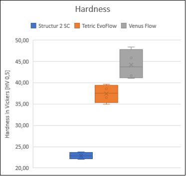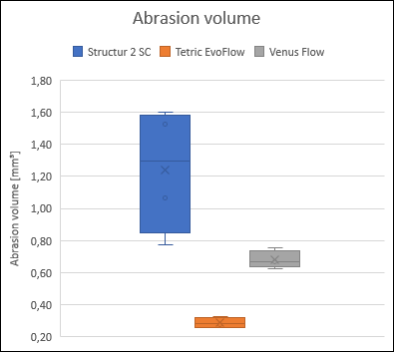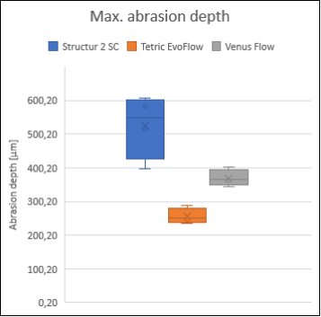 在Voco Structur 2 SC扁平試樣上,使用四個(gè)不銹鋼圓錐體和四個(gè)硬質(zhì)合金圓錐體作為拮抗劑。在蒸餾水中,以50N進(jìn)行240,000個(gè)在咀嚼模擬循環(huán)后(相當(dāng)于體外約1年),測(cè)量硬度,磨損量以及大深度。