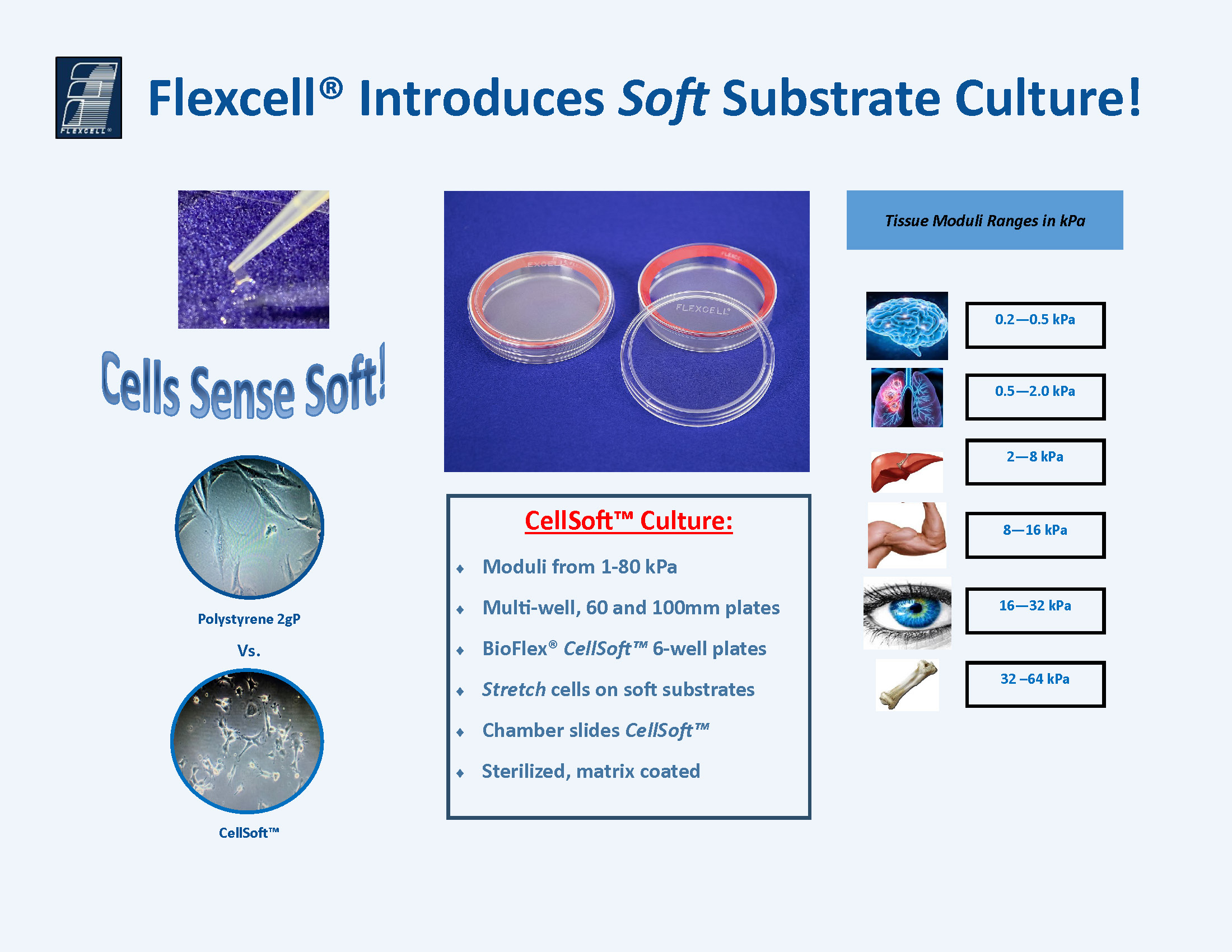 Cells sense soft! CellSoft™ offers softer substrates to match the material properties of tissue niches to better meet the needs of biological laboratories wanting to grow their cells on native stiffness。