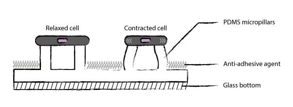 通過測量PDMS微柱響應于細胞施加的力的撓度來進行力評估。