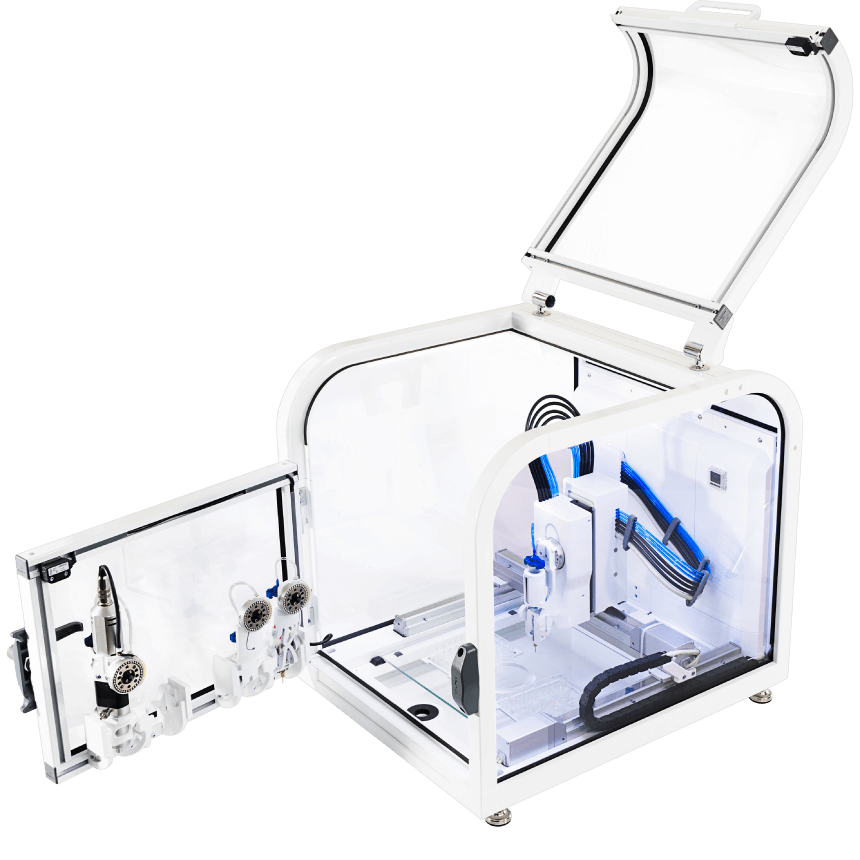 可以實(shí)現(xiàn)高精度和高分辨率的打印多種不同類型的細(xì)胞。設(shè)備尺寸為80厘米(高)x 70厘米(寬)x 57厘米(高),包括一個(gè)微型操縱臂和一個(gè)電動(dòng)平臺(tái),用于精度定位其打印機(jī)頭和樣品