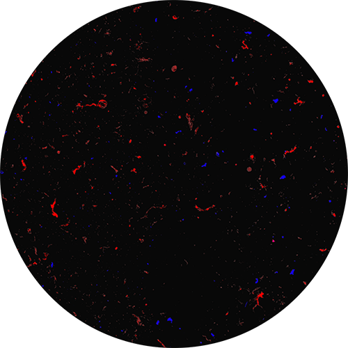 在來自Aura的組合明場(非蛋白質(zhì),藍(lán)色)和熒光(蛋白質(zhì),紅色)圖像中,觀察到熱應(yīng)激AAV2樣品中衣殼高度聚集。