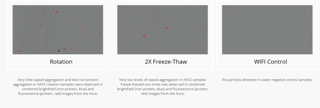 在來自Aura的組合明場(非蛋白質(zhì),藍(lán)色)和熒光(蛋白質(zhì),紅色)圖像中,在AAV2旋轉(zhuǎn)樣品中觀察到的衣殼聚集非常少,非蛋白質(zhì)聚集較少。