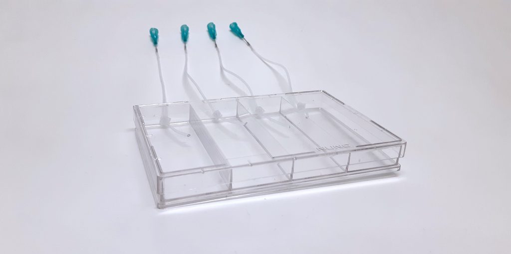 四、多芯片組合模塊 可以把4個可牽張或壓縮的芯片整合在一起,12個微結(jié)構(gòu),允許機(jī)械刺激每個平臺,并以wu菌方式光學(xué)監(jiān)控培養(yǎng)物