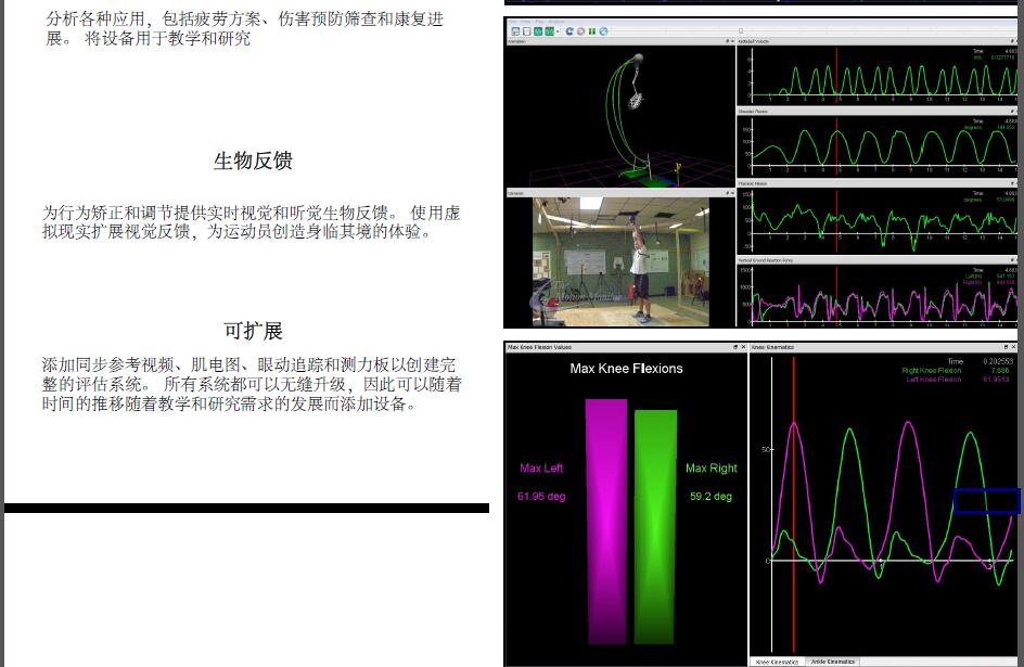 該系統(tǒng)從豐富分析工具集合中生成的數(shù)據(jù)可立即通過數(shù)據(jù)輸出的圖形顯示進行回放。 令人驚嘆的 3D 計算機渲染對象動畫可以被視為骨架、簡筆畫或人形。集成使用市場上廣泛硬件實現(xiàn)對人體運動、大腦活動、眼球運動、肌肉募集和作用在身體上的外力實時測量。
